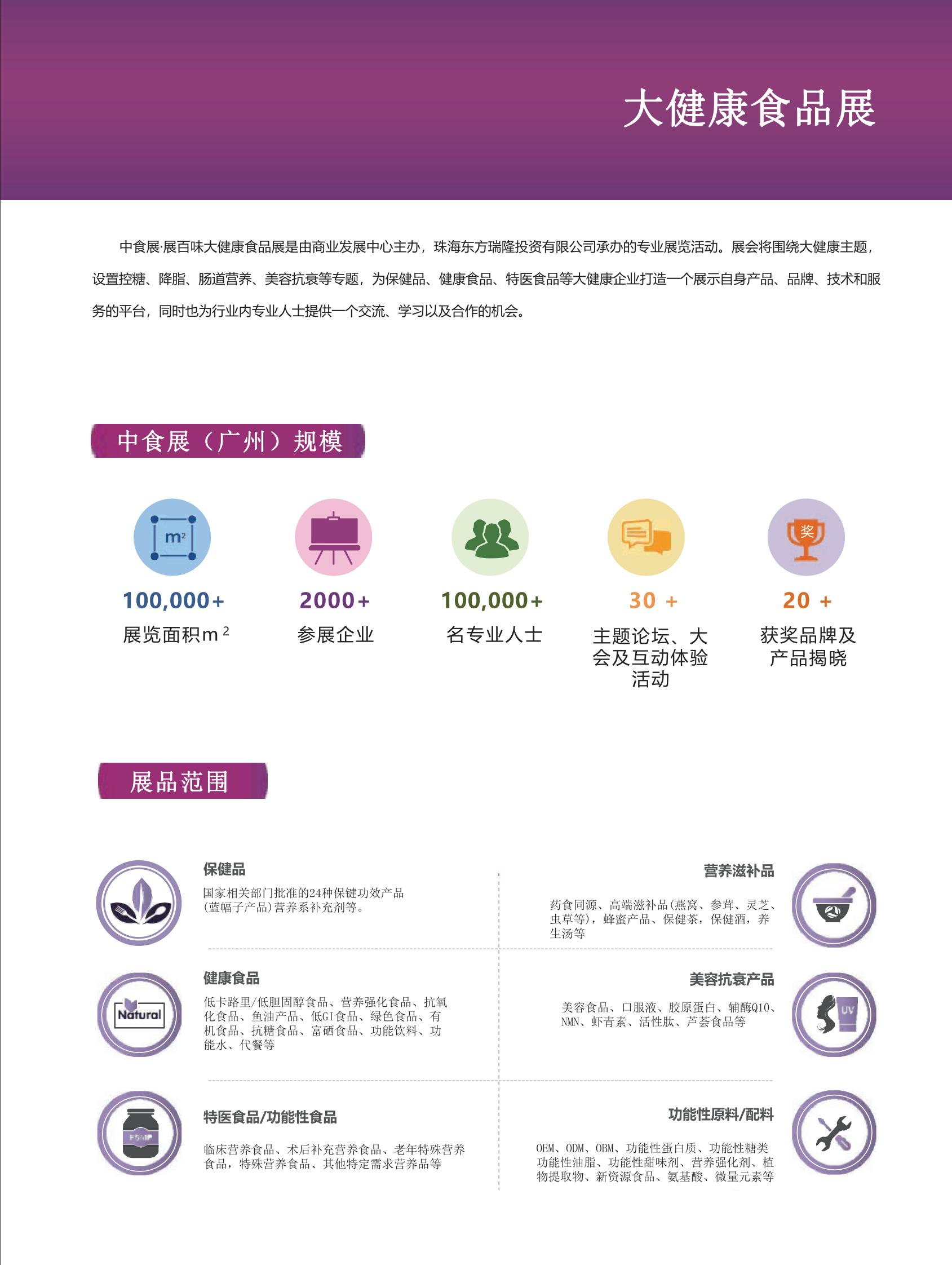 中食展·展百味大健康食品展是由商业发展中心主办,珠海东方瑞隆投资有限公司承办的专业展览活动。展会将围绕大健康主题设置控糖、隆脂、肠道营养、美容抗衰等专题,为保健品、健康食品、特医食品等大健康企业打造一个展示自身产品、品牌、技术和服务的平台,同时也为行业内专业人士提供一个交流、学习以及合作的机会。